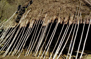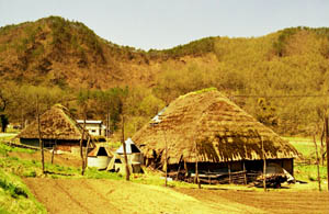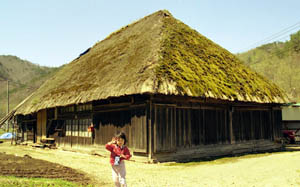 葛巻町は岩手県の東北部、北上山地の中にある町で、かつて街道の交差する宿場町として栄えた。また、牛馬や木炭の産地で知られているが、町の総面積の86%が豊かな森林資源に囲まれる酪農と林業の町である。 鈴鹿口集落は、沼宮内野田街道を沼宮内から葛巻宿へ向かう途中、山形川に沿って走る国道がトンネルで迂回したため、ひっそりとした集落が残った。 草葺屋根の民家が数棟残っているがすべて直家であり、山形川が作った山間の坪庭のような場所である。 画家佐藤章氏もこの場所を描いている。 |