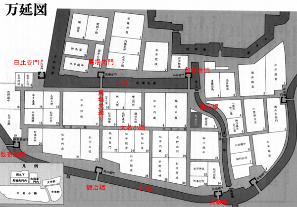 「丸の内」という呼名は、御曲輪内という意味から出た言葉と思われる。つまり、御曲輪内である江戸城の内郭が完成した1629年、外郭が完成した1636年以降に生まれものといわれている。 内郭は、大手前郭(今の大手町あたり)、西の丸下郭(今の皇居前広場)、大名小路郭(今の丸の内)の3郭より成っていた。大名小路郭と大手前郭との間には江戸城への物資供給ルート道三堀(今の永代通りあたり)があった。大名小路郭には、馬場先門、和田倉門、日比谷門に至る東西の通りと、中央を貫く南北の通りにより区画され約200M以上の大きな整形の街区で、大名屋敷が整然と並んでいた。 明治維新後、新政府は早急に近代国家を建設するよう努めた。丸の内周辺では、洋風建築が建ち並び、大名屋敷跡が錬兵場となった。 |