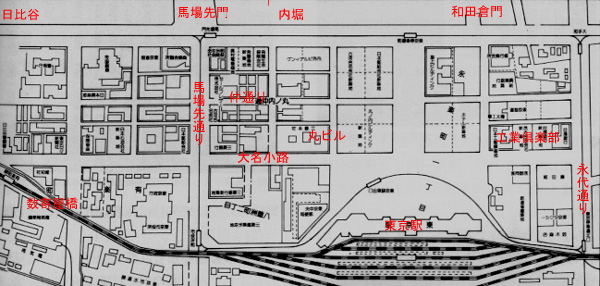 大正時代に入ると、大正3年の東京駅開業に合わせて駅前地区の開発が始まる。 馬場先通りを中心に建設された英国式オフィスビルに変わって、東京駅前にはアメリカ式の事務所建築が現れるようになる。東京駅から内堀に向かって真っ直ぐに伸びる大通り(現在の行幸通り)が整備され、東京海上ビル、三菱本社、日本郵船ビルなどの大型事務所建築が建設される。そして大正12年、東京駅前には最新の技術を駆使した丸ビルが誕生した。丸ビルは、一般人が自由に出入り出来る商業店舗をビルの中に備えた新しいスタイルのオフィスビルであった。 和田倉通りは馬場先通りと同様、和田倉門に通じる江戸時代からある通りである。この通りには、東京銀行集会所や日本工業倶楽部といった倶楽部建築があいついで建設された。 大正12年、関東大震災により、警視庁庁舎、帝国劇場、大手町の官庁建築などが焼失した。丸ビルや工業倶楽部などの残った建物は、補修工事を行い蘇る。震災復興事業として、行幸通りが完成する。 昭和4年、丸の内の町名地番が改正され、道三町・銭瓶町→大手町、永楽町・八重洲町→丸の内となる。また、東京駅八重洲口が開業し外堀上に駅前広場が造られる。 各所で大型のオフィスビルの建設が進む。東京海上ビル新館(昭和5年)、第一銀行本店(昭和5年)、日清生命館(昭和7年)、東京中央郵便局(昭和8年)、明治生命館(昭和9年)、鉄道省(昭和12年)、第一生命館(昭和13年)など。 昭和20年、東京空襲により東京駅、皇居、都庁らが炎上する。昭和22年、外堀の埋立てが完成する。 |
