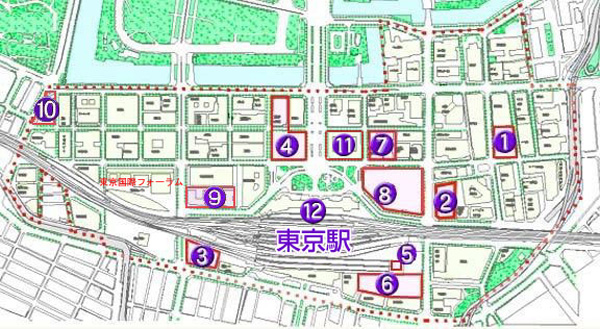 ![]() 1.東京サンケイビル(第T期 H12.9竣工、第U期 H14.9竣工) 2.新大手町ビルの全館リニューアル(H13年夏完了) 3.パシフィックセンチュリープレイス丸の内(H13.11竣工) 4.丸ビル・三菱商事丸の内新本社ビル街区(丸ビル街区 H14.8竣工) 5.JR東海事務所ビル計画(H14年度竣工予定) 6.東京駅八重洲北口計画(H16年竣工予定) 7.日本工業倶楽部会館・三菱信託銀行本店ビル共同開発計画(H15.2竣工予定) 8.(仮称)丸の内1丁目1街区(東京駅丸の内北口)開発計画(H16.8竣工予定) 9.東京ビル(H18年度竣工予定) 10.日比谷パークビル(H18年度竣工予定) 11.新丸ノ内ビル(H19年度竣工予定) 12.東京駅周辺の開発・整備について |