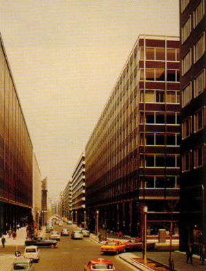 丸の内総合改造計画により、高さ100尺の高層オフィスビルに建て替えられた仲通りの景観。