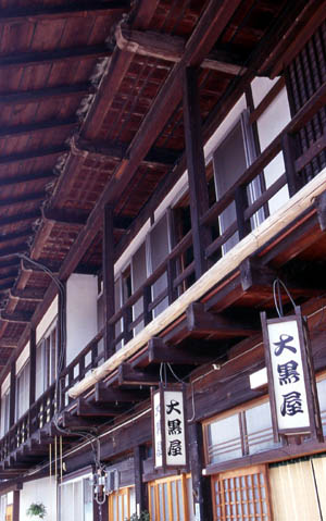 六合村は、入山、生須、小雨、太子、赤岩、日影の六つの部落が合併してできたので六合村という。四方を山に囲まれた山村であるが、草津温泉が古くから開けていたため、草津温泉との経済的な関係が強い農村でもある。 というのも、六合村は草津で温泉を営む人々が、酷寒を避けて冬の間だけこの村に移り住んだことから、明治時代以前より「冬住の里」と呼ばれていた。 小雨にある大黒屋は、「冬住の里資料館」として公開されており、当時の暮らしぶりがわかる民具や文献を展示している。中には草津を訪れた文人らが残した美術工芸品や塗物もある。 六合村の民家は、大黒屋にみるような出桁セガイ造りの総2階建て民家が多く、板葺き石置き屋根がオリジナルである。 出桁の先端まで2階の壁を持ち出したり、床に板を張ってバルコニーにしたりしている。これは養蚕の影響で、2階の蚕室をより大きく確保するためであったと思われる。2階の外壁は、白壁と窓のパターンや化粧貫など、うつくしい意匠をもっている。 |